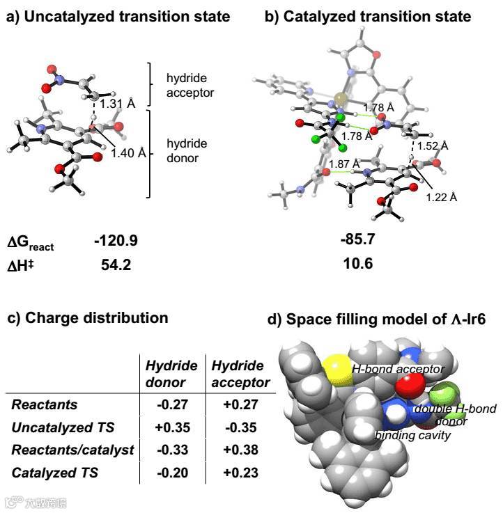 作者为了探究氢键的相互作用,培养了金属Ir的三氟乙酸负离子的络合物。此外,作者通过计算化学阐明催化剂和底物的作用模式(Figure 5)。