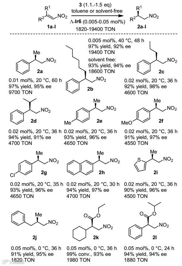 近日,Eric Meggers教授发展了新一代含有氢键供体的手性金属Ir络合物催化剂。该催化剂是C2对称性的,每个Ir络合物中含有两个催化位点,显现出非常高效的催化活性。作者研究了β,β-二取代不饱和硝基烯烃的不对称转移氢化反应,该反应使用Hantzsch酯作为氢源,催化结果非常优秀,底物普适性非常好,不管是以含不同取代基的芳环或杂芳环的β,β-二取代不饱和硝基烯烃,还是以烷基或酯基等取代的β,β-二取代不饱和硝基烯烃作为底物,都能以优秀的产率(91%-97%),优秀的对映选择性(91%-98%)得到重要的手性β,β-二取代硝基化合物(Figure 2)。TON高达20250。催化剂用量更是低达0.004%,该催化剂是目前催化该类反应的所有有机小分子和金属催化剂中用量最少的。(Metal-Templated Design: Enantioselective Hydrogen-Bond-Driven Catalysis Requiring Only Parts-per-Million Catalyst Loading. J. Am. Chem. Soc., 2016, DOI: 10.1021/jacs.6b02769)