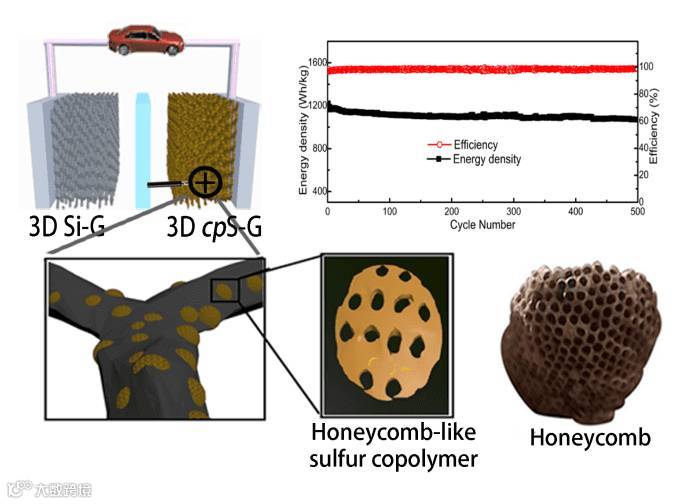 近日,北京航空航天大学的李彬、杨树斌、李松梅等构建了具有高能量密度的硅-硫全电池。这种全新的(锂化)硅-硫二次电池是采用锂化的硅作为负极和共聚和硫作为正极,经过容量匹配后得到的全电池。采用锂化的硅取代金属锂作为负极材料,解决了使用具有高活性锂所带来的安全隐患。基于热共聚原理,添加1,3-diisopropenylbenzene (DIB)作为共聚和助剂,通过一步热聚合在三维石墨烯骨架上原位生成蜂窝状共聚硫,获得可直接作为电极材料使用的三维共聚硫-石墨烯(cpS-G)复合材料。制备过程中引入的强共价键在循环过程中具有固定硫的作用,抑制了充放电循环过程中聚硫化物在电解液中的溶解,提高的正极的循环稳定性。经过电池调控后构建的硅-硫全电池具有优异的储能性能,其能量密度高达1147Wh/kg(基于电极材料的总质量),每个循环过程容量仅仅衰减0.028%(500个循环)。这一研究为锂硫电池的研究和应用提供了重要思路。