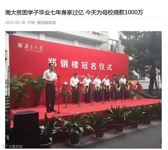 事情是这样的,5月底一天,国内知名的高等学府南京大学举办了一场冠名仪式,把一栋有50多年历史的教学楼改名为“郑钢楼”,郑钢是谁?堂堂南京大学为什么用他的名字为教学楼冠名?于是这家曝点素材,那家写个故事,郑钢的经历也就逐渐在人们眼前生动起来。