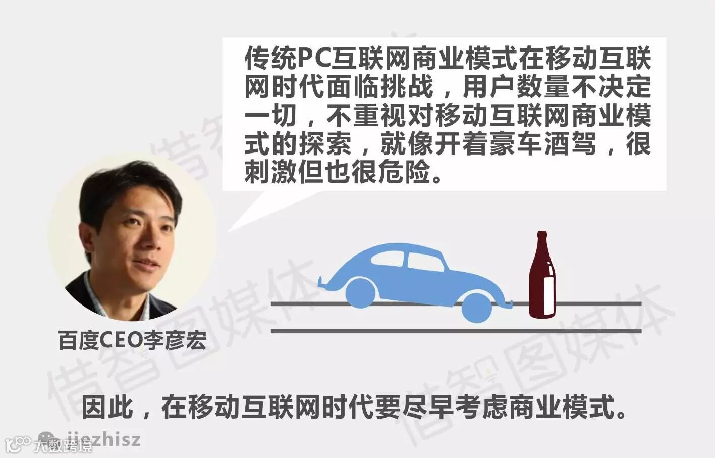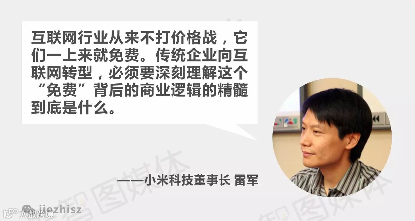 PC互联网的商业模式是通过入口级产品获取用户,把控网络流量,最后通过流量变现来获取盈利。移动互联网的商业模式是通过极致的产品和服务来获取用户,把用户变成自己的“粉丝”,然后通过跨界整合资源来为用户提供更好的用户体验,最终提高用户的收入均值,形成有黏性的用户平台后再寻找盈利模式。