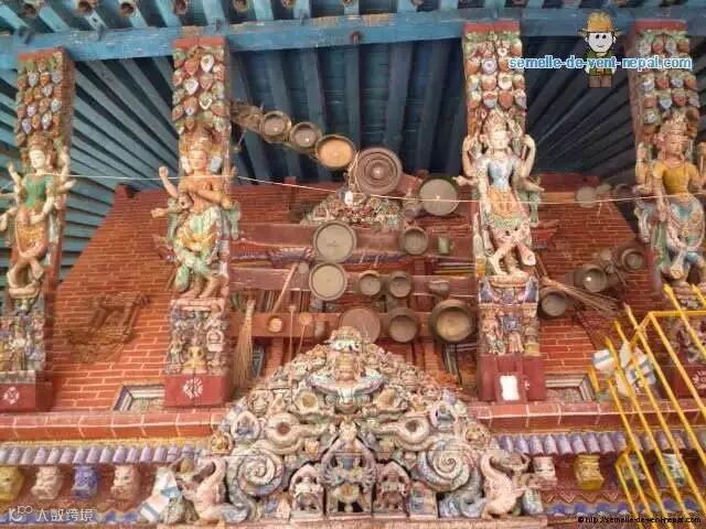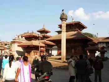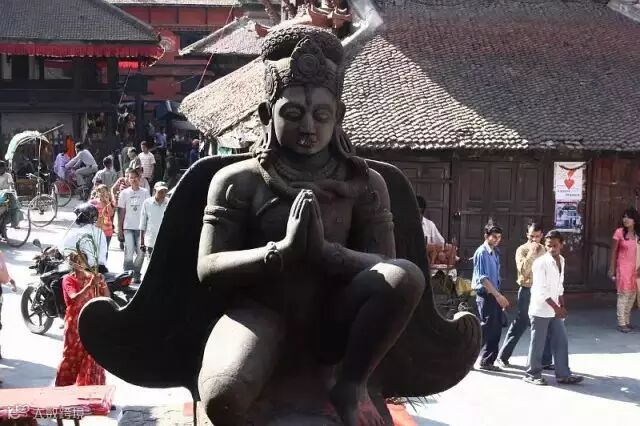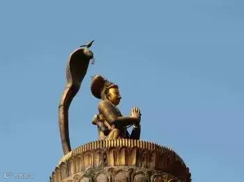 这是尼泊尔国王Yoganarender Malla在世时为自己修建的雕像。国王坐在莲花宝座上,护有眼镜蛇华盖。蛇头上有一只鸟。据说只要这只鸟在,国王就能重回他的宫殿。所以在帕坦的王宫中有个房间,一直有为他预备的床位和水烟袋。面对国王雕像的窗户也一直敞开的。