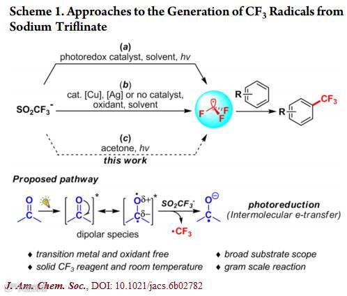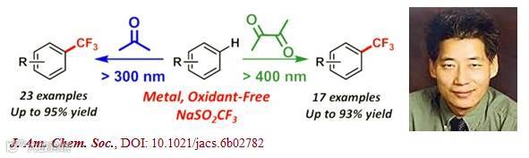 最近,加拿大皇家科学院院士、麦吉尔大学的李朝军(Chao-Jun Li)教授课题组在JACS上报道了简便清洁的光引发芳基三氟甲基化反应,体系不添加任何金属和氧化剂,反应温和高效、绿色环保。李朝军教授是华人有机化学家中的佼佼者,在绿色化学方面特别是水相中的反应研究,成果丰硕。(Simple and Clean Photoinduced Aromatic Trifluoromethylation Reaction. J. Am. Chem. Soc., DOI: 10.1021/jacs.6b02782)