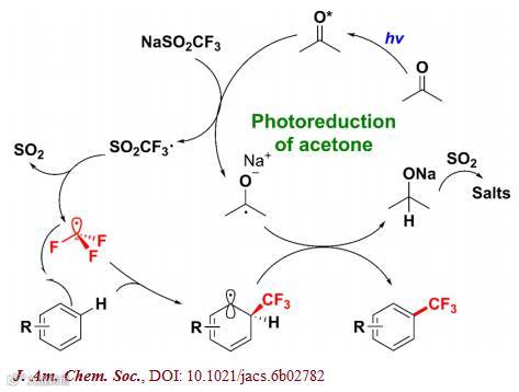 丙酮在紫外光作用下发生n,π*跃迁早已被报道也被应用到很多反应中。李朝军小组研究了丙酮在紫外光作用下的吸收,然后对反应条件进行了探讨,发现光的波长和强度对反应都有较大的影响,控制反应条件还可以得到苯环上含有两个三氟甲基的产物。基于实验结果,研究人员认为反应可能发生如下历程:首先光激发丙酮跃迁,激发态的丙酮夺取三氟甲磺酸负离子的一个电子生成三氟甲磺酸自由基,继而脱除二氧化硫生成三氟甲基自由基,然后与芳烃反应,接下来被异丙醇自由基负离子攫取芳环上的氢得到芳基三氟甲基产物(如下图)。