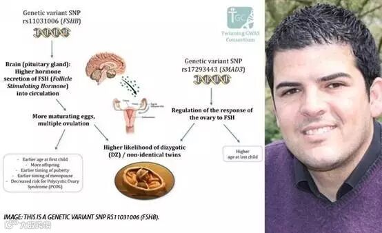 为了揭开这个难解之迷,Boomsma的同事、分子遗传学家Hamdi Mbarek率领的一个研究小组对此展开了深入研究,将约2000名异卵双胞胎的母亲与非双胞胎母亲及同卵双胞胎母亲的数据进行了对比。功夫不负有心人,经过对海量数据的分析,他们最终发现,有两个单核苷酸多态性(SNP)与生出异卵双胞胎宝宝的概率提高有关,他们的研究结果近日发表在《美国人类遗传学杂志》(The American Journal of Human Genetics)上。