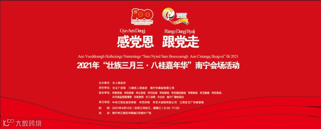 感党恩 跟党走——南宁市2021年“壮族三月三·八桂嘉年华”主场活动暨第六届华南城“三月三”民俗文化节将于4月10至18日在南宁华南城举行,重头戏之一南宁市2021年“壮族三月三·八桂嘉年华”主场活动将于4月14日举行,本次活动主题分为“南宁有韵”、“南宁有味”、“南宁有爱”、“南宁有礼”等特色版块,同时重点展示南宁市本土文化旅游精品线路。值得一提的是,今年的三月三活动与党史教育相融合,通过快闪、红歌大家唱等丰富多彩的形式,让大家在浓浓的壮乡氛围中,感受幸福生活的变化。