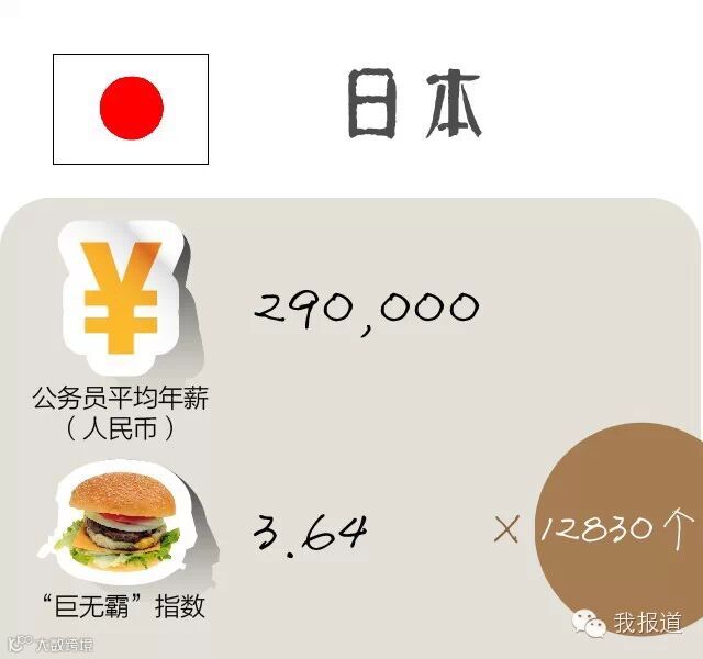 2014年,日本国家公务员年均收入(工资加奖金)约为29万人民币,一个巨无霸3.64美元,约合人民币22.6元,日本一位公务员的年薪足够支付12830个巨无霸,是德国的2.3倍。