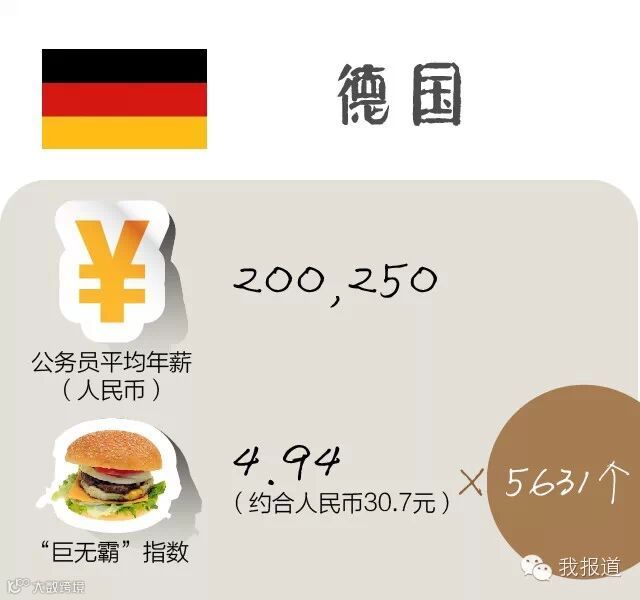 据Gehalts Reporter 2014年统计,德国公务员平均月薪为2005.67欧元,即年薪为27,816美元(约合17.3万人民币)。按照4.94美元的“巨无霸指数”来算,德国一位普通公务员一年能买得起5631个巨无霸。