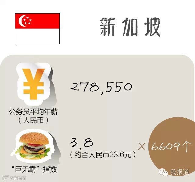 根据新加坡公共服务部数据显示,一个刚工作的公务员月薪最高约为2,800新币(约合13000人民币),之后逐级提高,最高可达16,540新币(约合76792人民币)。按照新加坡“巨无霸指数”,一位刚毕业的公务员一年可买6609个巨无霸。