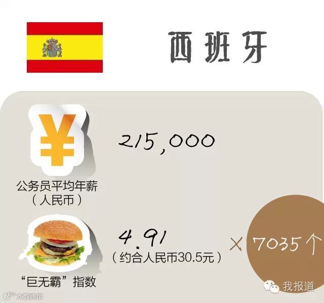 西班牙国家统计局2012年发布的报告显示,西班牙公务员的税前平均工资(缴税及扣除养老金之前)为29,811欧元(约合21.5万人民币),比全国平均工资22,790欧元高出30.8%。按照“巨无霸指数”来计算,西班牙一位公务员一年能买7035个巨无霸,和美国差不多。