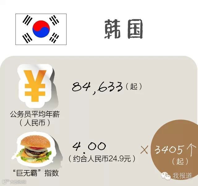按照最低公务员年薪13620美元来算,韩国公务员最低工资一年也可以消费得起3405个汉堡。