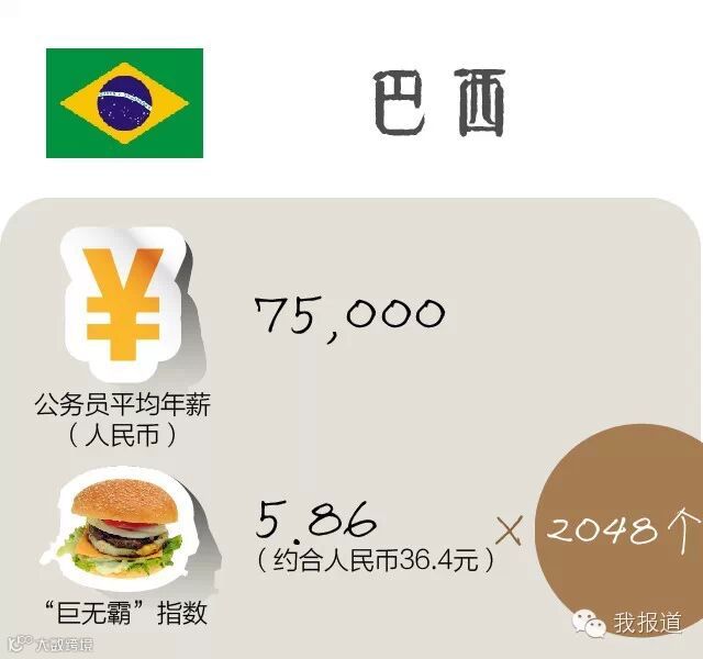 在巴西,公务员是一个高收入职业,平均月收入约为3000雷亚尔(约合6200人民币),年人均收入约合7.5万人民币,几乎是巴西居民平均收入水平的四倍。不过巴西巨无霸还挺贵,公务员一年工资只够买2048个。