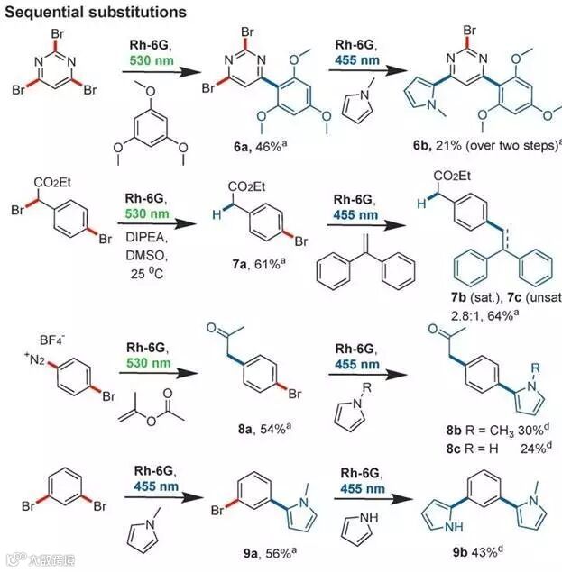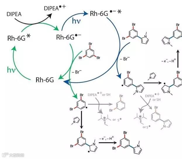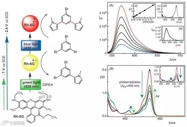 罗丹红6G(Rhodamin 6G,Rh-6G)在光作用下产生不同的激发态,已经广泛地应用于生物领域,但在催化反应领域的应用还非常少见,该研究小组首次将Rh-6G应用到光催化的芳基化反应中。Rh-6G在氩气环境中,经可见光和二异丙基乙基胺的作用能够得到稳定的自由基负离子Rh-6G•¯,从Scheme 2中A/B可以看出Rh-6G在绿光和蓝光范围内都有吸收峰,而Rh-6G•¯只在蓝光区有吸收峰。Rh-6G在绿光作用下可以生成激发态的Rh-6G*,激发态的Rh-6G*还原电势为-0.8V vs SCE;Rh-6G*在碱作用下能够生成Rh-6G•¯,还原电势升至-1.0 V vs SCE,Rh-6G•¯能够1,3,5-三溴甲苯中一个碳溴键断裂并与N-甲基吡咯进行芳基化反应得到单取代产物;Rh-6G•¯在蓝光作用下生成激发态的RRh-6G•¯*,Rh-6G•¯*的还原电势达到了-2.4 V vs SCE,能够活化1,3,5-三溴甲苯中两个碳溴键,得到双取代产物。