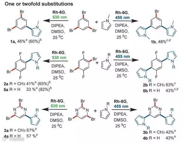 最后基于实验结果,研究小组提出了如下反应机理:绿光引发Rh-6G 生成Rh-6G*,Rh-6G*攫取碱DIPEA上一个电子得到自由基负离子Rh-6G•¯,Rh-6G•¯活化碳溴键得到芳基自由基,该自由基与N-甲基吡咯加成最终得到单取代产物;当使用蓝光时,Rh-6G•¯被激发为Rh-6G•¯*,Rh-6G•¯*可以进一步活化碳溴键,并N-甲基吡咯加成得到双取代产物(Scheme 5)。