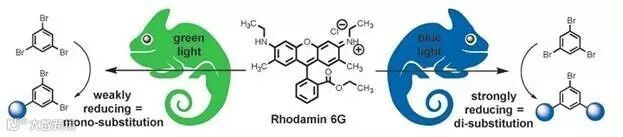 最近,德国雷根斯堡大学的Burkhard König教授在《Angew. Chem. Int. Ed.》报道了一项很有意思的发现,通过使用不同颜色的可见光实现化学反应选择性的调控。研究小组使用染料罗丹红6G(Rhodamin 6G),在绿光作用下仅能活化芳基溴化物上的一个碳溴键得到单取代产物;在蓝光作用下能够继续活化碳溴键得到双取代的产物(Scheme 1)。(Chromoselective Photocatalysis: Controlled Bond Activation through Light-Color Regulation of Redox Potentials. Angew. Chem. Int. Ed., 2016, DOI: 10.1002/anie.201602349)