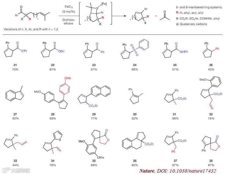研究人员采用非常廉价的FeCl3作催化剂,催化量(5%)的条件下,二氯乙烷作溶剂,室温条件就可以顺利发生羰基-烯烃关环复分解反应,构建含有多取代双键的五元环、六元环,反应非常温和,操作也极其简便,许多底物都取得了中等到良好的收率,具有很好的官能团容忍性(酯基、酰胺、卤素等),而且可以实现大量的制备。Corinna S. Schindler说,“这个反应非常容易操作,不需要昂贵的试剂,你甚至可以在空气气氛中完成反应。”