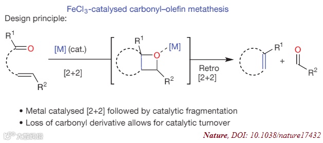 复分解反应(Metathesis),被人们形象地称为“交换舞伴”,熟知的有烯烃复分解反应、炔烃复分解反应、烯炔复分解反应等,都发展的较为成熟。羰基-烯烃复分解反应(carbonyl-olefin metathesis)虽然早有报道,但发展还不够成熟,要么需要非常苛刻的反应条件,要么需要当量的过渡金属催化剂(Ru、Mo等)。近期,密歇根大学化学系的Corinna S. Schindler课题组在《Nature》上发表文章,在羰基-烯烃复分解领域做出了革命性的突破。(Iron(III)-catalysed carbonyl-olefin metathesis. Nature, DOI: 10.1038/nature17432)