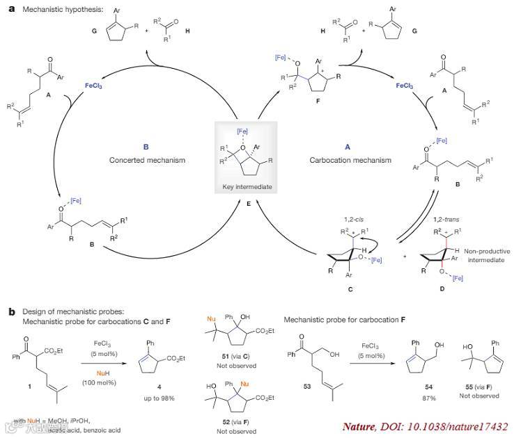 研究人员也提出了反应可能的机理:要么是分步的过程,要么是协同的机理。通过实验验证,并未有捕捉到分步过程的中间体,同是密歇根大学化学系的Paul M. Zimmerman教授也给出了计算化学的佐证,他采用了称之为“ZStruct”的反应发现方法,在可能的几千种反应途径中,发现只有协同过程通过四元环过渡态能量是最低的,从而证明了铁催化的羰基-烯烃关环复分解反应是经由协同过程的机理。