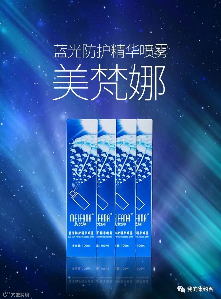美梵娜蓝光防护精华喷雾,精选天然精华,绿色安全,温和无刺激,有效阻隔紫外线和蓝光辐射,长久保护肌肤健康,有效调节改善肌肤抗氧化能力,深层修复肌肤损伤,增强肌肤弹性;舒缓干燥,冰爽保湿,锁水修复, 肌肤平皱,修复细胞,美白淡斑。