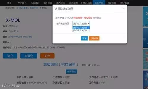 点击“申请职位”后,在弹出窗选择准备投递的简历,最后点击“立即申请”完成在线投递