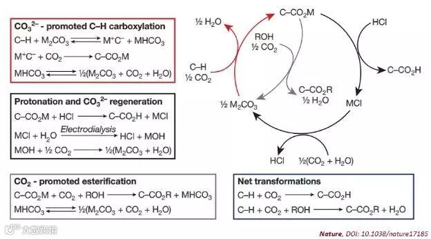 这种新策略受到了自然界光合作用的启发,核酮糖-1,5-二磷酸羧化酶/加氧酶(RuBisCO)在光合作用的一个关键步骤中,使核酮糖-1,5-二磷酸去质子化产生碳中心亲核体,随后与二氧化碳反应形成羧酸酯,从而构建了新的C-C键。这个团队设想了一个碳酸盐驱动的C-H羧化反应,在含有铯或钾阳离子的熔盐中,碳酸根离子能够可逆地使一个C-H键失去质子生成碳酸氢根离子和一个碳中心的亲核体,这个亲核体与二氧化碳反应形成C–CO2–。随后碳酸氢根离子分解,这样总的结果是每产生一个C–CO2–就消耗1/2当量的碳酸根和二氧化碳。该循环可通过C–CO2–与强酸反应质子化和利用电渗析再生酸和碱来完成闭环,实现了用C-H和二氧化碳净转化成C-CO2H,而无需使用任何其它化学计量的试剂。
