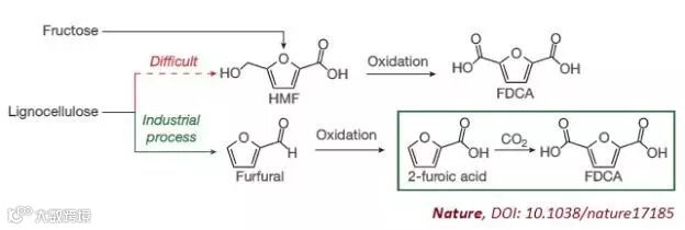 为了验证他们的策略,他们用这个方法以2-呋喃甲酸和二氧化碳为原料,合成了有着重要化工用途的呋喃-2,5-二羧酸(FDCA)。FDCA可以用来生产名为聚乙烯呋喃二甲酸(PEF)的塑料,这种塑料可以用来代替应用广泛的聚乙烯对苯二甲酸酯(PET)。而2-呋喃甲酸则很容易通过现有工艺从木质纤维素(lignocellulose)中制得,这使得这一方法比现有的FDCA工业化生产方法有很大的成本优势。