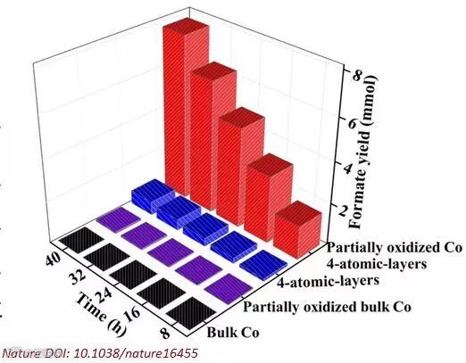 在这项研究中,该团队的研究人员尝试了一种新的方法,使用纯的或混合的钴和氧化钴制成4个原子厚的薄层。他们发现,与普通结构相比,原子薄层表面的钴原子在电还原二氧化碳成甲酸中具有更好的活性和选择性,以及更低的过电势。并且,这些原子层在部分氧化的条件下,活性进一步提高,实现了超过40个小时的约10毫安/平方厘米的稳定电流密度,对甲酸的选择性达到大约90%,过电势仅有0.24伏特。同等条件下,这种催化剂的表现超过了其它已知的金属或金属氧化物。