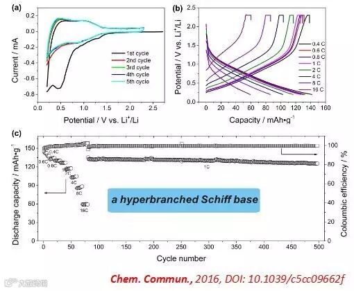 中国地质大学(武汉)的孙玉宝讲师和程寒松教授设计合成了一种超支化Schiff碱聚合物,该聚合物通过4,4',4''-三醛基取代三苯胺与对苯二胺缩聚而成,具有可逆和稳定的电化学“脱/嵌”锂的特性。半电池测试结果表明,该聚合物电极“脱/嵌”锂的可逆电极电势是0.7 V (vs. Li+/Li);0.4 C下的可逆比容量是140 mAh/g,16 C下的可逆比容量是60 mAh/g,1 C倍率下运行400个循环后容量保持在125 mAh/g。课题组还将该材料做成软包电池进行弯折测试,发现其具有很好的柔韧性。综上,这种超支化Schiff碱聚合物非常适合用于柔性薄膜电池的负极材料。