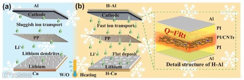 华中科技大学黄云辉教授、许恒辉教授团队创新性设计了一种多层复合集流体结构:核心为聚酰亚胺/碳纳米管(PI/CNTs)焦耳加热层,该加热层置于两层绝缘聚酰亚胺层中间,最外层磁控溅射两层高导电性的导电金属涂层(Adv. Funct. Mater. 2025, e14172)。