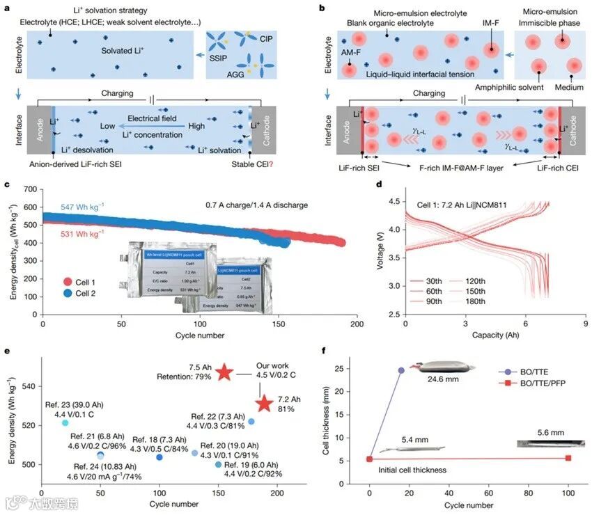 华中科技大学黄云辉、袁利霞团队和浙江大学陆俊团队提出基于液-液界面张力(γL–L)的界面调控新策略,发明了一类新型的非均相微乳电解液,成功将溶解性较差的功能性溶剂组分引入至电解液体系。通过分子设计,使全氟溶剂与局部氟化两亲性溶剂通过分子间作用力络合形成微乳胶团(50-120 nm),将氟化相均匀稳定地分散于电解液连续相中,进一步利用γL–L驱动力使这些功能组分迁移,同步富集于正负极界面,构建梯度分布的氟化界面溶剂化层(Nature, 2025, 643, 1255–1262)。