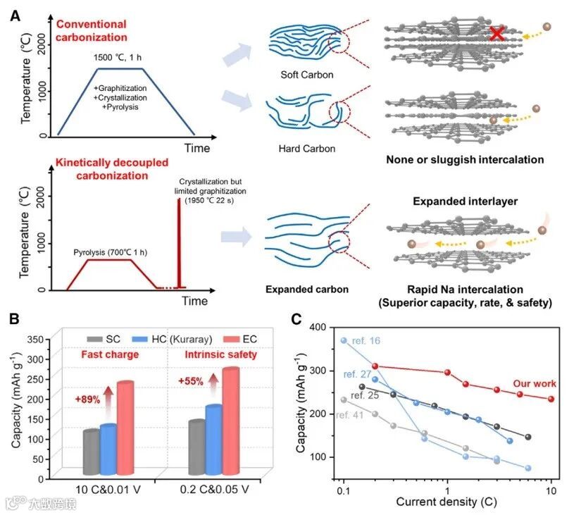 姚永刚教授、黄云辉教授、方永进教授、朱书泽教授团队提出了一种基于瞬态高温的动力学解耦碳化策略,即从精确的前驱体结构到精细的碳化过程控制再到准确的碳结构,可控制备了膨胀碳基负极材料,显著提高了钠离子电池负极的容量、倍率和循环稳定性(Joule, 2025, 9, 101812)。