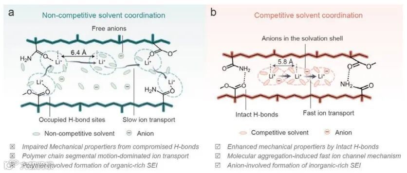 华中科技大学黄云辉、许恒辉团队在基于含氢键官能团的聚(甲基丙烯酸甲酯-共聚-甲基丙烯酰胺)(PMAm)凝胶电解质中,引入了对锂离子具有强亲和力的丁二腈(SN)分子。通过竞争配位策略,将原本与聚合物链上氢键位点配位的锂离子释放并转移至溶剂分子中,从而保证聚合物链间氢键网络的完整性,维持凝胶电解质的机械性能。此外,聚合物链间氢键的形成会压缩聚合物骨架的间隙空间,这种压缩使得溶剂分子和离子处于分子聚集状态。这种聚集不仅为锂离子提供了快速扩散通道,还增强了阴离子对锂离子溶剂化壳层的参与度,从而促进形成富含无机成分的稳定固体电解质界面(SEI)(Adv. Mater. 2025, 37, e04625)。