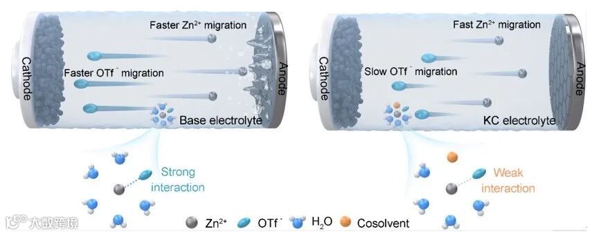 华中科技大学黄云辉教授团队针对共溶剂引入难以避免的动力学损失问题,提出了一种削弱阴阳离子间相互作用和提高Zn2+迁移数的动力学补偿机制,在一定程度上补偿了因共溶剂引入造成的动力学损失。以含有EC的Zn(OTf)₂基水系电解液为模型体系,验证了共溶剂电解液策略在实现水系锌二次电池的动力学补偿以及提升其电化学性能方面的有效性(J. Am. Chem. Soc. 2025, 147, 8607-8617)。