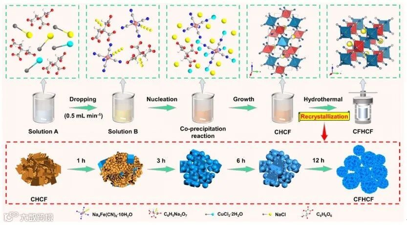 上海大学乔芸、刘阳,温州大学侴术雷,华中科技大学黄云辉团队提出了一种重结晶驱动的策略,用于合成具有高度结晶性和高振实密度(0.992 g cm–3)的单斜相普鲁士蓝类似物(CFHCF)(ACS Energy Lett. 2025, 10, 1751–1761)。