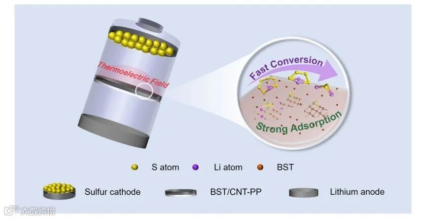 华中科技大学黄云辉、武汉理工大学赵文俞设计了一种 Bi0.5Sb1.5Te3/碳纳米管(BST/CNT)夹层,通过提供广泛的吸附位点和从 BST 热电材料产生的热电场来增强Li-S电池的耐久性(Adv. Mater. 2025, 37, 2500457)。