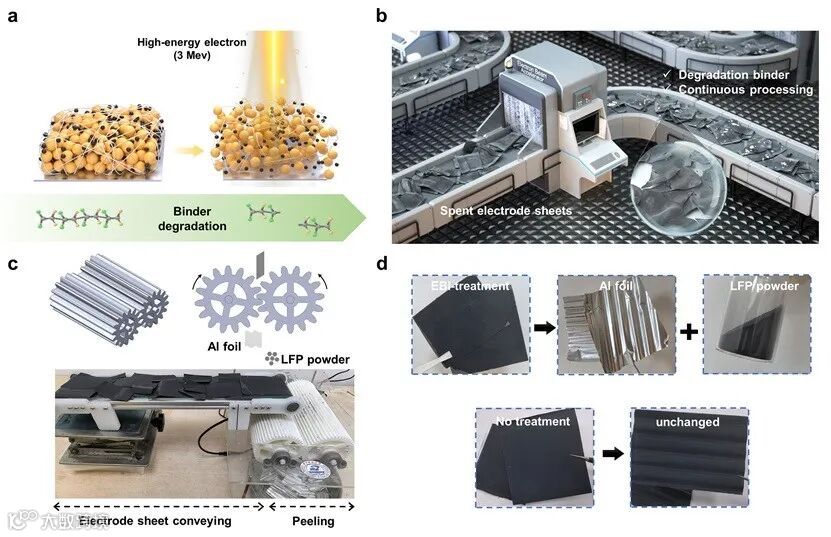 黄云辉、沈越团队提出一种基于电子束辐照(EBI)的磷酸铁锂(LiFePO4,LFP)直接回收策略。电子束辐照可选择性降解聚合物粘结剂,使磷酸铁锂能从集流体上高效剥离(eScience, 2025, DOI: 10.1016/j.esci.2025.100501)。