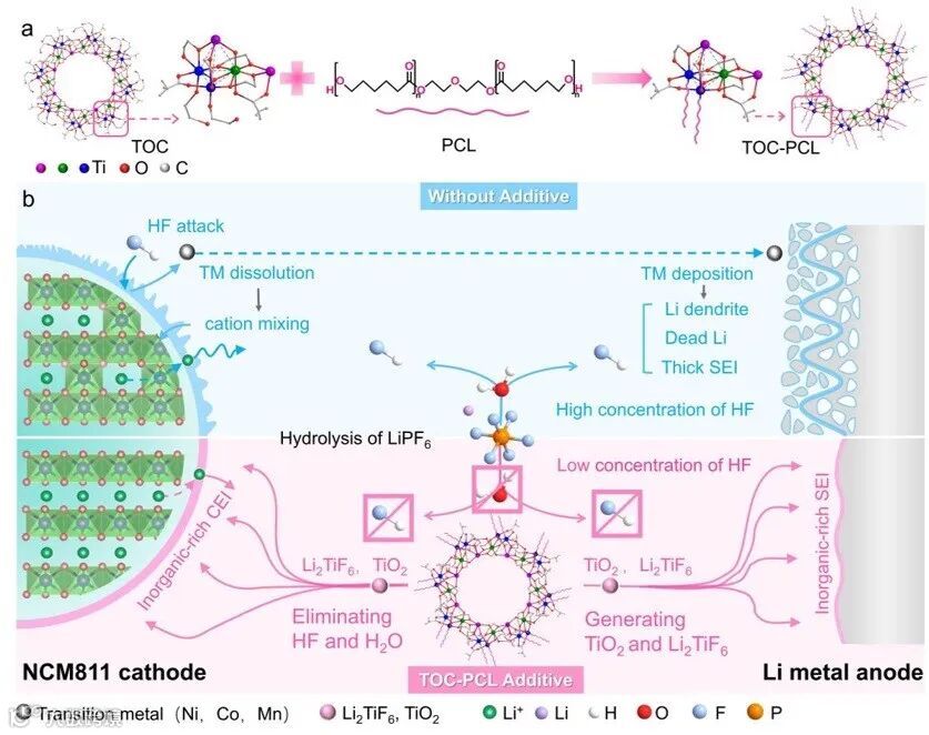 华中科技大学黄云辉教授和裴非副研究员带领研究团队提出将聚己内酯二醇修饰的钛氧簇(TOC-PCL)用作多功能电解液添加剂,以调控高镍正极与锂负极的界面化学。电解液中的微量H2O 和HF通过TOC-PCL的水解作用被有效清除,随后在循环过程中原位构建出富含无机成分(TiO2、Li2TiF6和LiF)的稳定电极-电解质界面,大幅抑制了界面化学侵蚀(J. Am. Chem. Soc. 2025, 147, 43655-43665)。