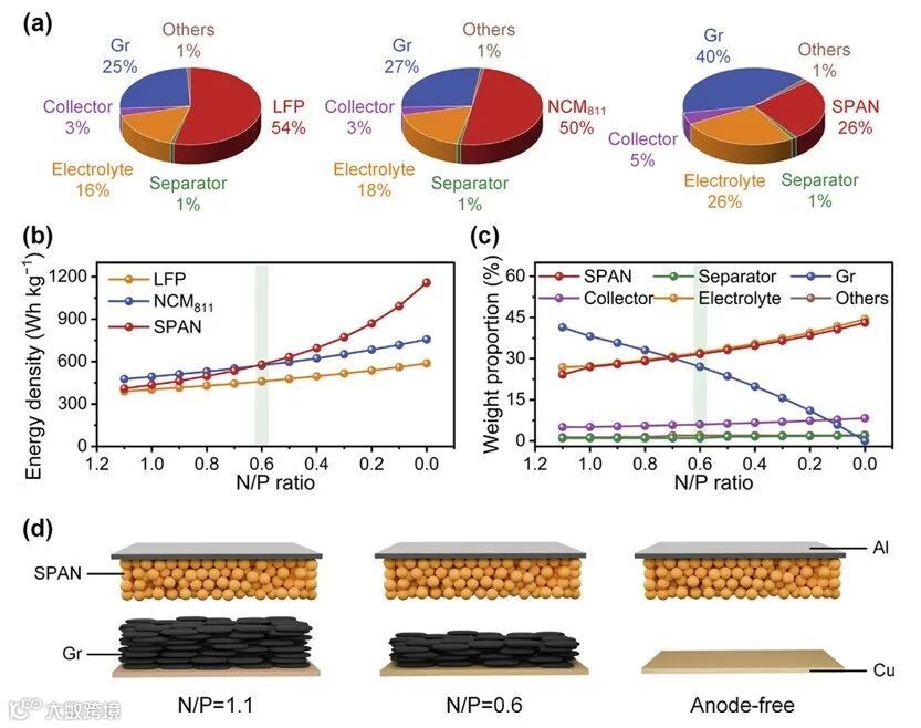 黄云辉教授与李真教授团队构筑了一种N/P=0.6的SPAN||Gr电池体系,通过简单的原位预锂化方式让电池成功运行。同时设计了一种阴离子介导的电解液(LiFSI/DME/HFE),这种电解液本质上是一种局部高浓电解液,可以抑制多硫化物的溶解和穿梭,可以抑制溶剂共嵌入石墨,同时对锂金属友好,抑制枝晶生长与各种副反应(Sci. Bull., 2025, DOI: 10.1016/j.scib.2025.08.052)。