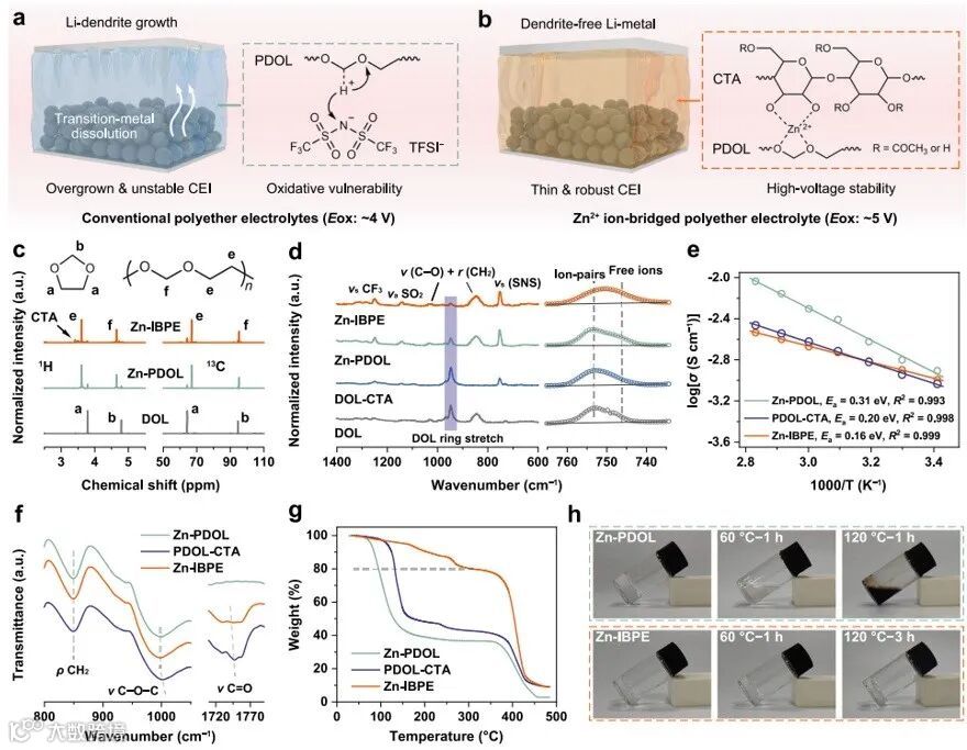 华中科技大学黄云辉、许恒辉团队提出了一种通过非锂金属离子与醚氧之间的桥接来显著提高聚醚电解质氧化稳定性的通用方法。为了证明离子桥接策略的可行性,制备了一种锌离子桥接的聚醚电解质(Zn-IBPE),其电化学稳定性窗口超过5 V,能够在4.5 V的锂金属电池中实现良好的循环稳定性(Nat. Commun., 2025, 16, 962)。