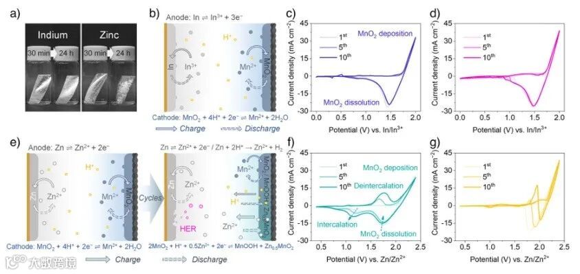 华中科技大学黄云辉、同济大学傅婧团队报道了一种酸性铟—MnO2电池(IMB)体系,通过阴离子调控界面化学实现阴负极处的可逆沉积-溶解反应。铟(In)的In3+/In氧化还原对具有更正的标准还原电位(–0.34 V vs. 标准氢电极),能够减少酸性介质中的寄生副反应(Angew. Chem. Int. Ed. 2025, 64, e202512463)。
