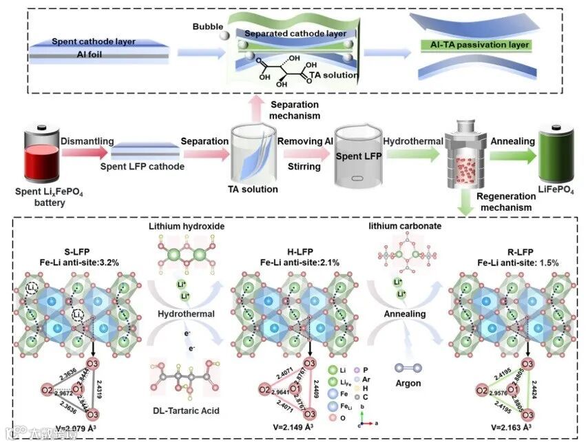 华中科技大学袁利霞教授/黄云辉教授团队通过酒石酸(TA)基水热处理和短暂退火,通过促进Li+沿晶体结构的[010]晶向重新嵌入,成功实现了LFP的再生(Energy Environ. Sci., 2025, 18, 3750–3760)。