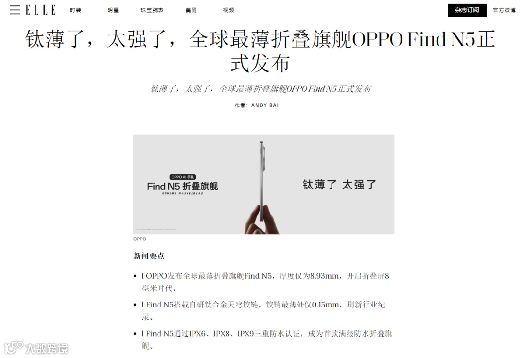 近些年来“跨界联动”也逐渐成为外媒营销的新趋势,而不仅仅专注于垂直媒体。比如OPPO新款折叠手机N5,其稿件阵营还覆盖了知名时尚媒体Elle、设计博客designboom等渠道,以不断强化该产品的时尚和美学属性。
