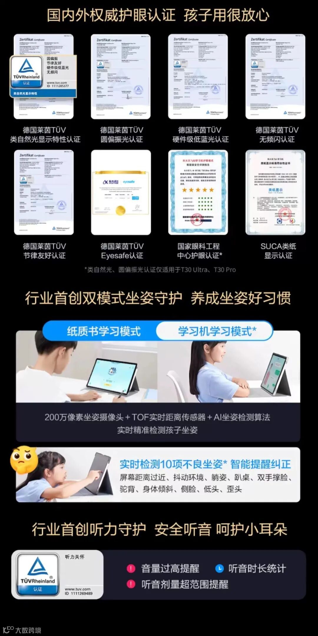 除了强大的学习功能,科大讯飞始终将青少年信息安全与用眼健康置于产品设计核心。安全方面科大讯飞AI学习机内置纯净学习系统,无游戏、无无关社交,家长端可实时管控学习动态,有效强化防沉迷效果,为孩子营造一个安全、纯净的学习环境。在护眼功能方面,科大讯飞AI学习机首创微纳米类纸屏,集全波段圆偏振光、硬件级低蓝光、DC调光无频闪、AI环境光检测算法、坐姿AI算法等多项先进技术于一体,获得国内外10多项权威护眼认证,从显示技术到用眼习惯全方位守护孩子视力健康。
