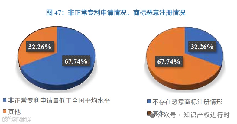 其中,非正常专利申请、恶意商标注册方面,全国约67.74%省份的非正常专利申请量低于全国平均水平;全国约32.26%的省份不存在恶意商标注册情形。
