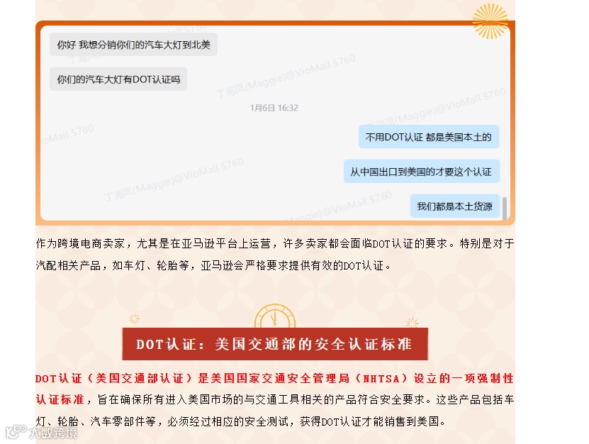 对于使用VIOMALL平台的分销商来说,完全不必担心DOT认证的问题。因为VIOMALL专注于美国本土货源,所有的产品都直接对接美国供应商,符合美国市场的相关法律和标准。因此,VIOMALL的分销商可以省去DOT认证的麻烦,直接将产品销售到美国市场。
