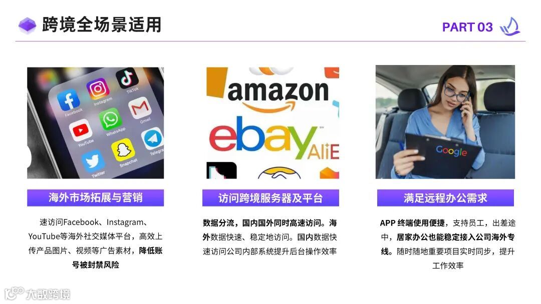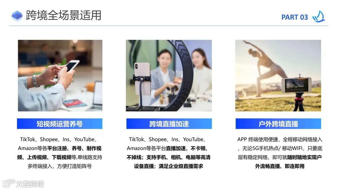 跨境电商全场景适用,包括短视频运营养号、跨境直播加速、户外跨境直播等。