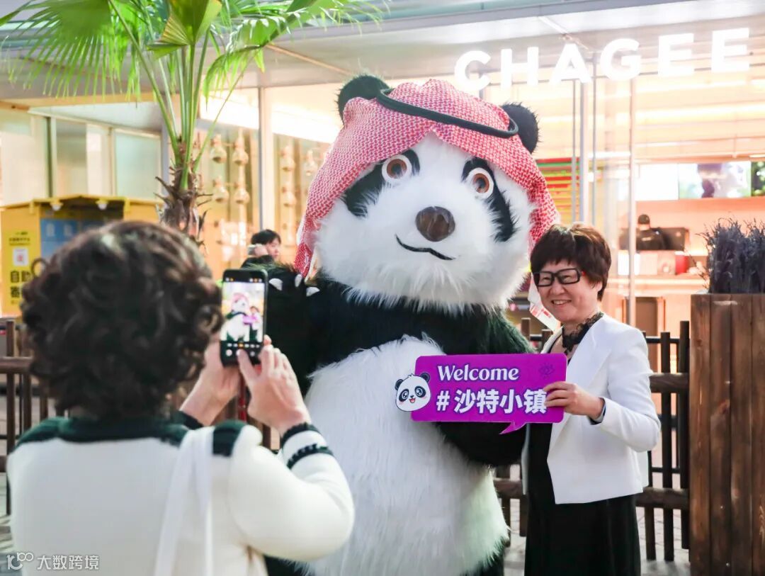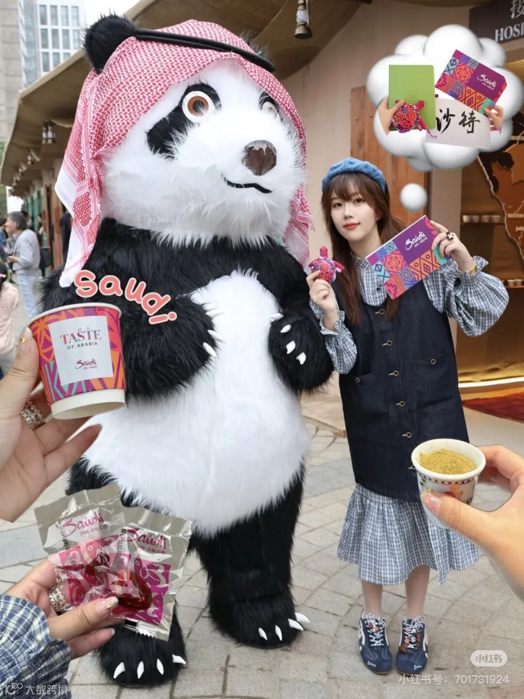 活动期间,这只化身“文化使者”的熊猫玩偶,无疑是全场最受欢迎的明星。它巧妙地融合了两种文化符号:熊猫是闻名世界的中国“顶流”萌宝,而沙特头巾则承载着深厚的异域风情。这一组合,超越了语言的隔阂,瞬间拉近了游客与沙特文化的心理距离,现场排起的合照长龙和游客们脸上的笑容,便是“文化共融”生动的写照。这一幕,让人联想到迪士尼乐园里人们与玩偶热情合影的场景——那种基于喜爱而产生的自发互动,正是体验式营销的魅力所在。