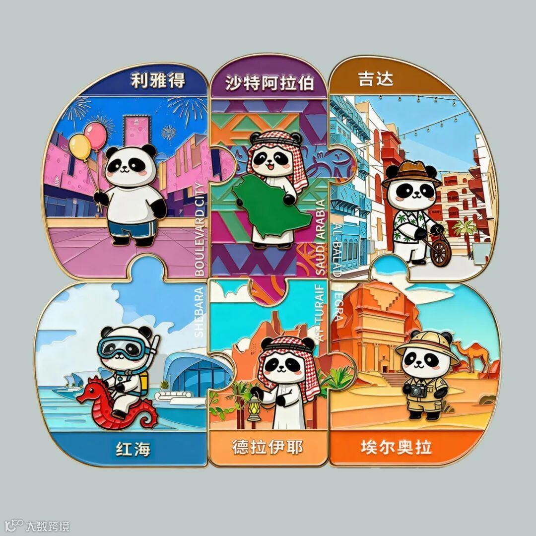在这样深厚的文化底蕴中,我们此次特别为沙特旅游局设计了一套独具匠心的限定徽章。整套徽章共六枚,它们不仅各自独立,分别代表了沙特不同的城市与旅游目的地,还可以像拼图一样拼接成一个完整的图形。