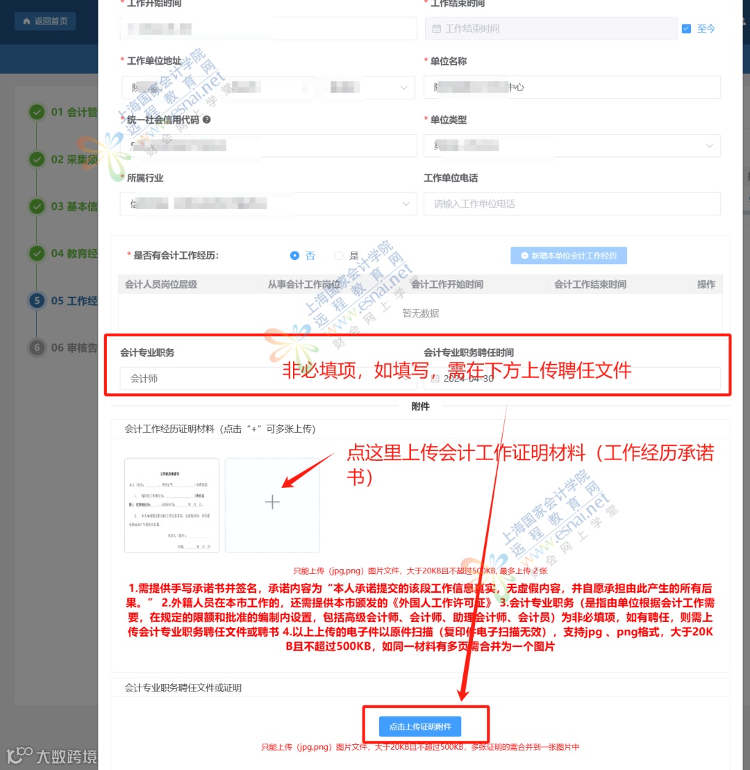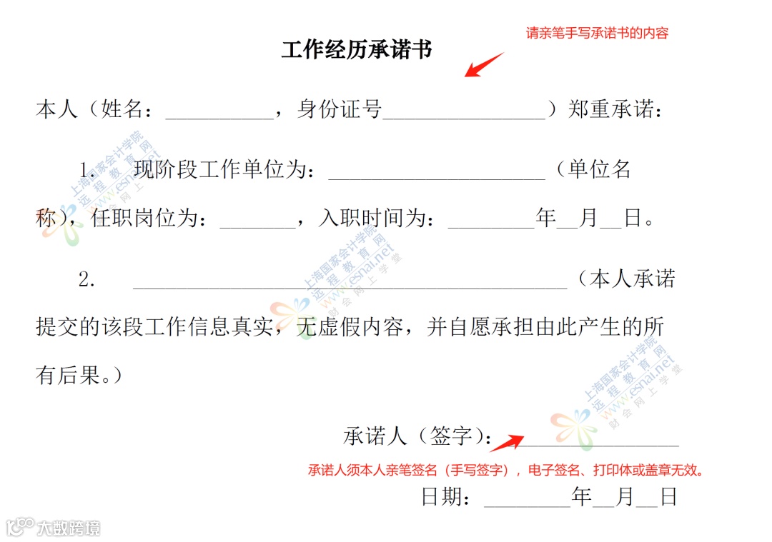 - 当前工作单位需上传本人亲笔签字的工作经历承诺书(打印签名、电子签名无效)。