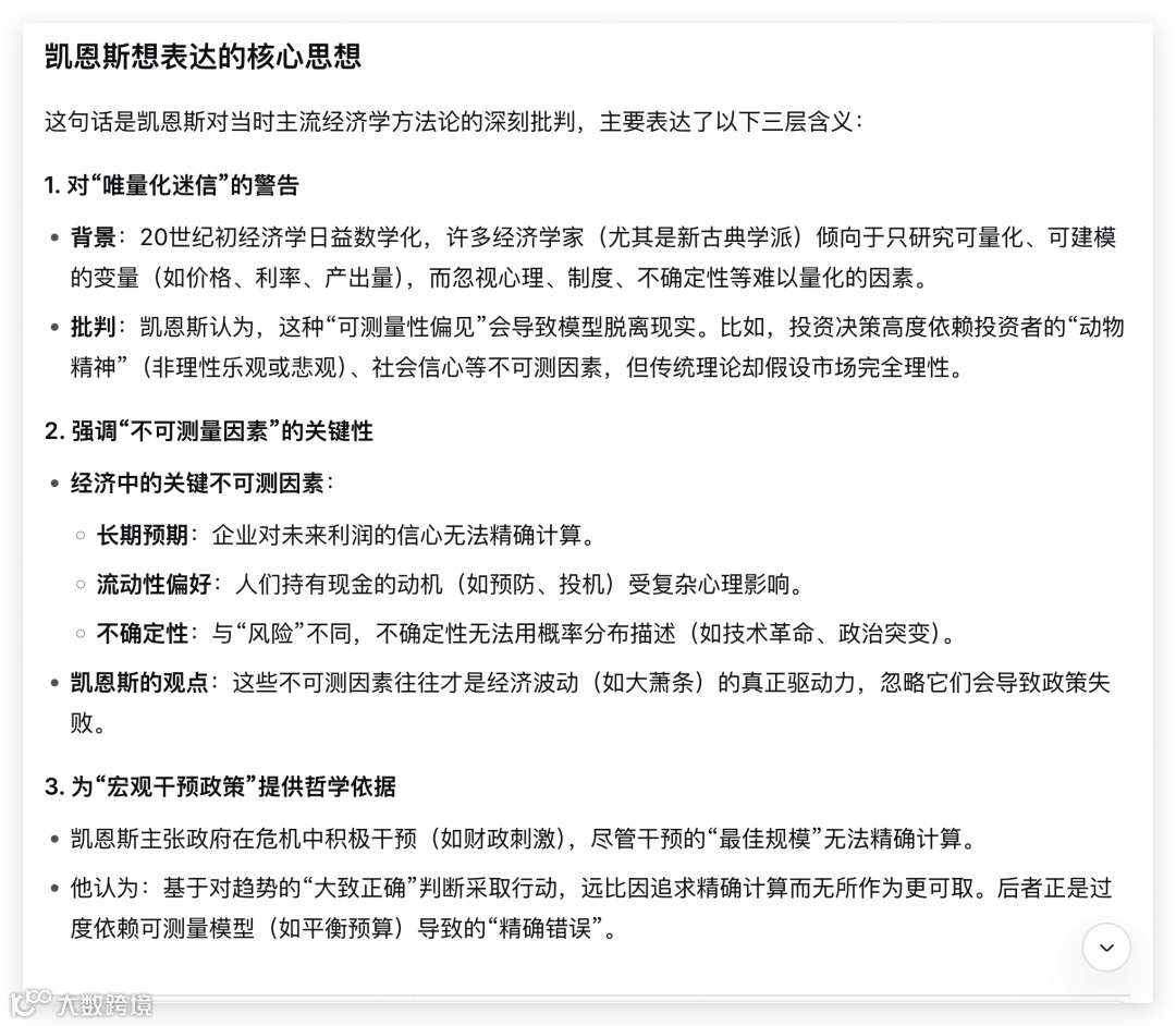 1. 粗略的正确好过精确的错误。因为那些精确错误的人,往往是过度依赖可测量因素,而忽略不可测量因素的结果。——凯恩斯